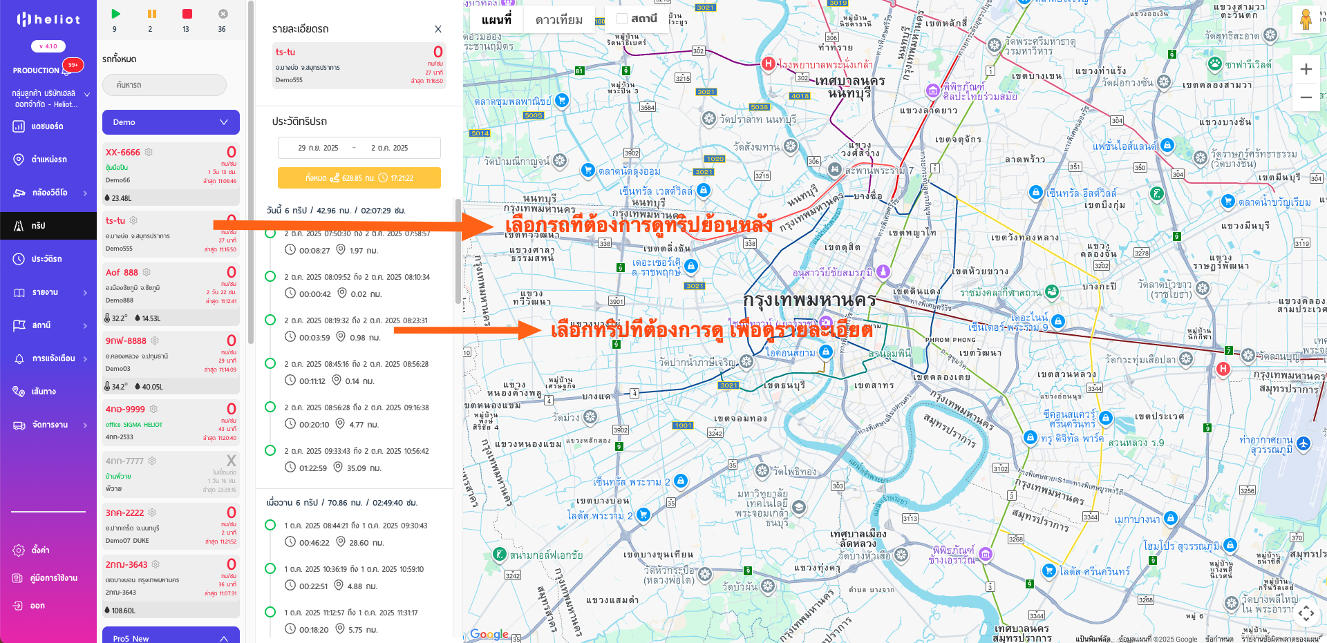 แสดงข้อมูลทริปของพาหนะแต่ละคัน โดยสามารถเลือกช่วงเวลาที่ต้องการดูได้