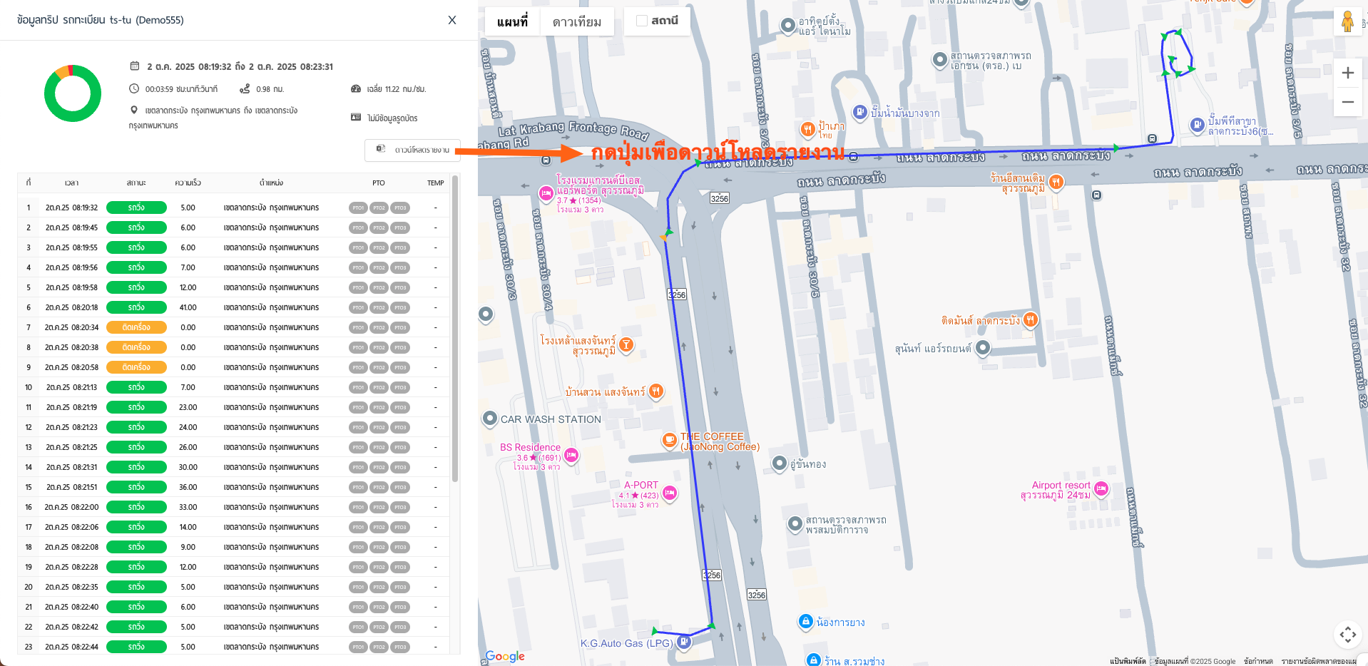 6. เมื่อกดเลือกทริปแล้วจะแสดงสถานะรถ ความเร็วในแต่ละจุด ข้อมูลจากอุปกรณ์เสริม เช่น ตัววัดอุณหภูมิ หรือ น้ำมัน และเส้นทางการเคลื่อนที่ของรถ ทั้งนี้ยังสามารถดาวน์โหลดรายงานของแต่ละทริปได้อีกด้วย